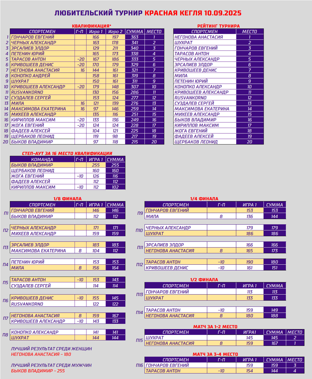 Поздравляем победителей и призеров и благодарим всех за участие! Следующий турнир «Красная кегля» состоится 3 декабря в 19:00.